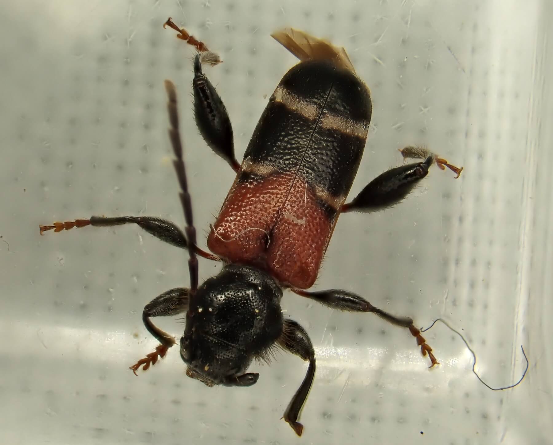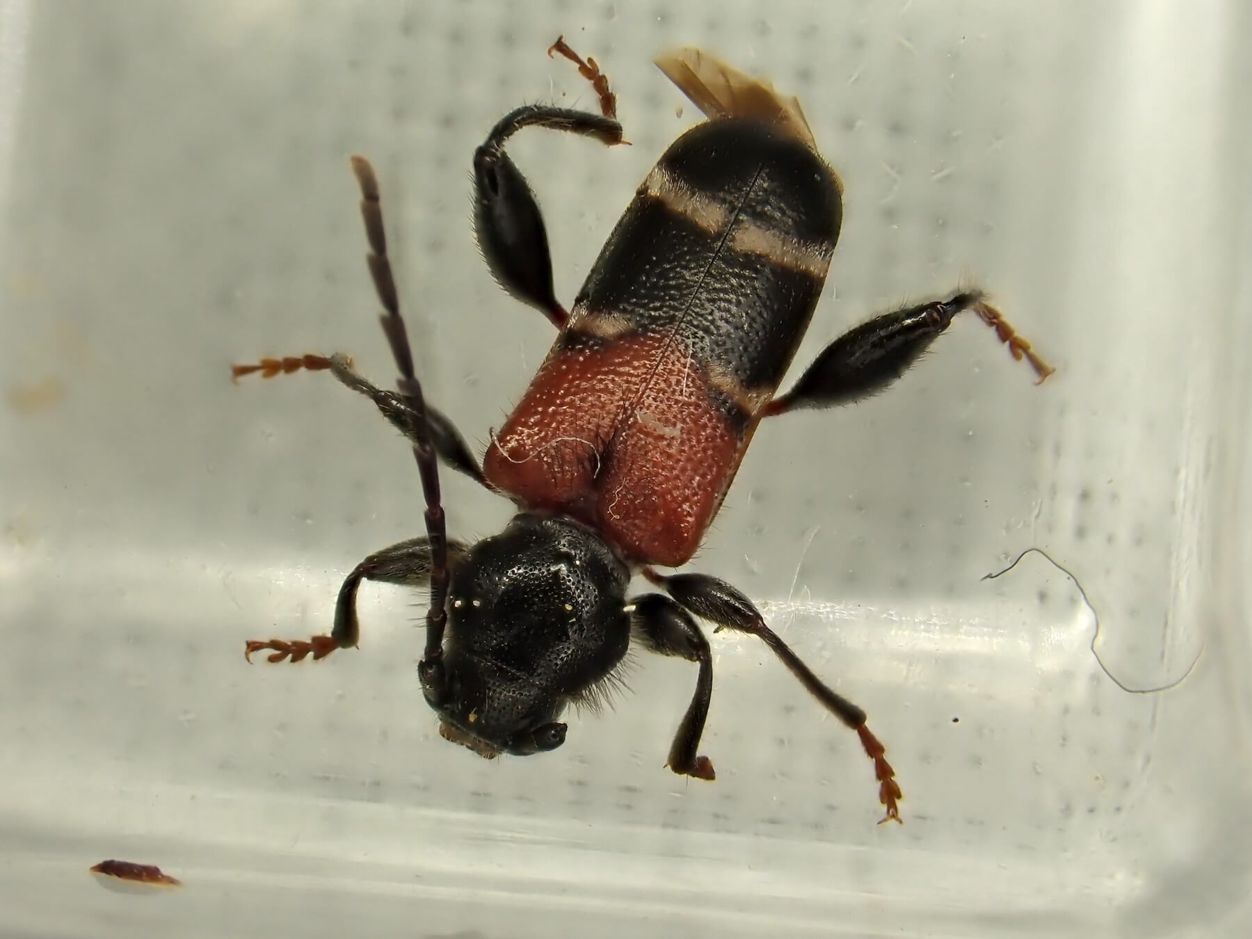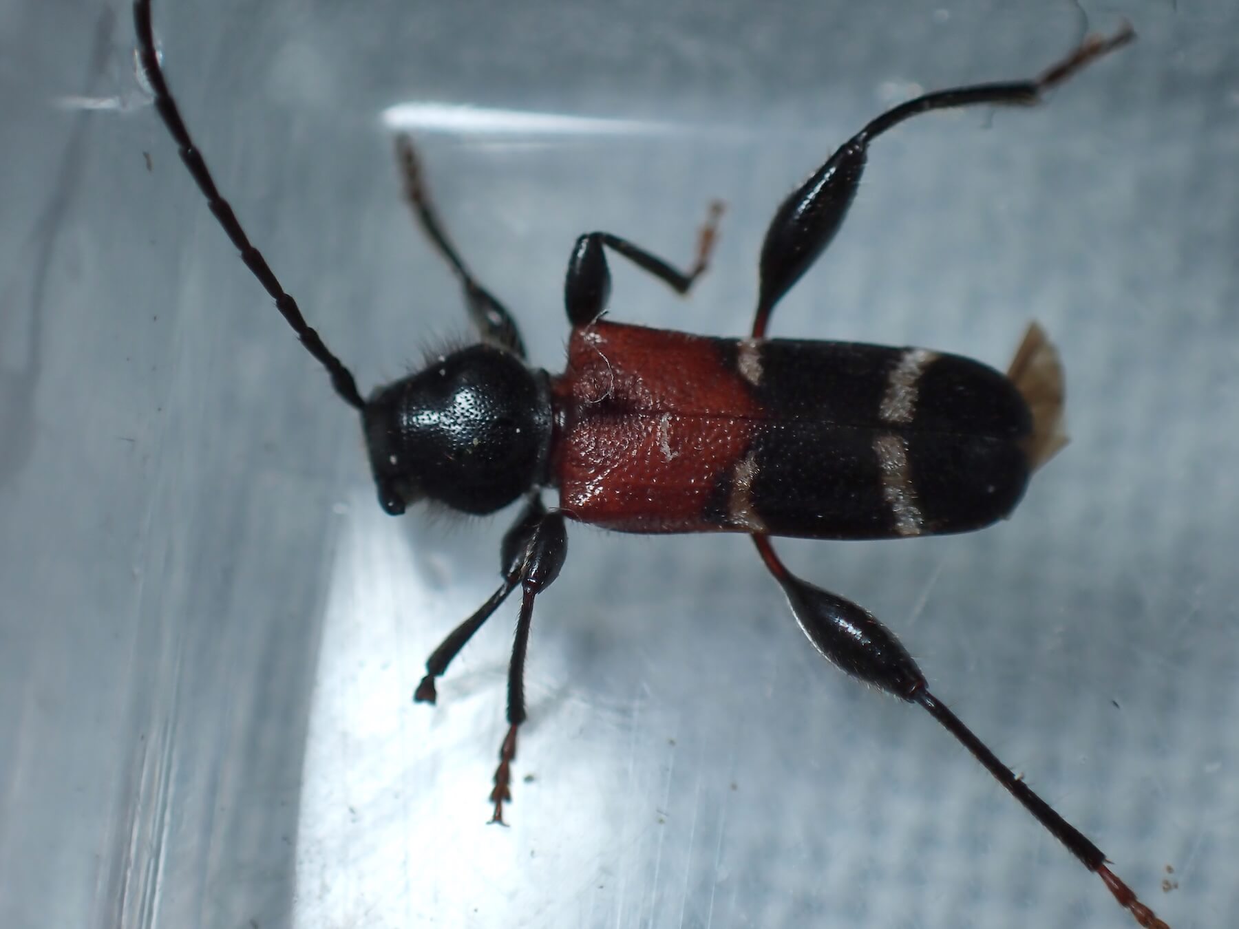 アカネカミキリ Tweet 2026/01/14 カミキリムシ アカネカミキリはヤマブドウなどにつく小型のカミキリムシ。腹部の胸部側が赤や褐色で、腹部に二本白い筋がある。 ビャクシンカミキリに似る。 もくじ 見かける頻度 分類 分布 宿主 大きさ アカネカミキリの写真 見かける頻度 ★★★★☆ 分類 カミキリ亜科/スギカミキリ族 分布 北海道〜九州 宿主 ヤマブドウ、フジ、サルナシなどの枯れ枝 大きさ 6〜9mm アカネカミキリの写真
