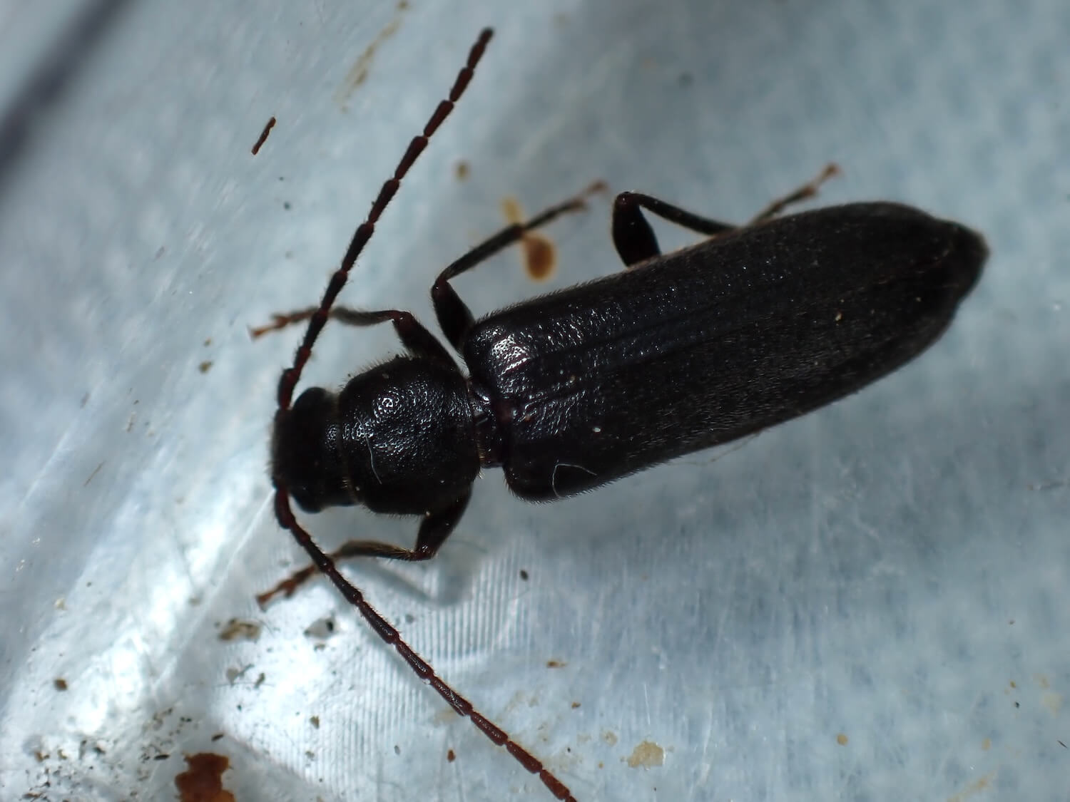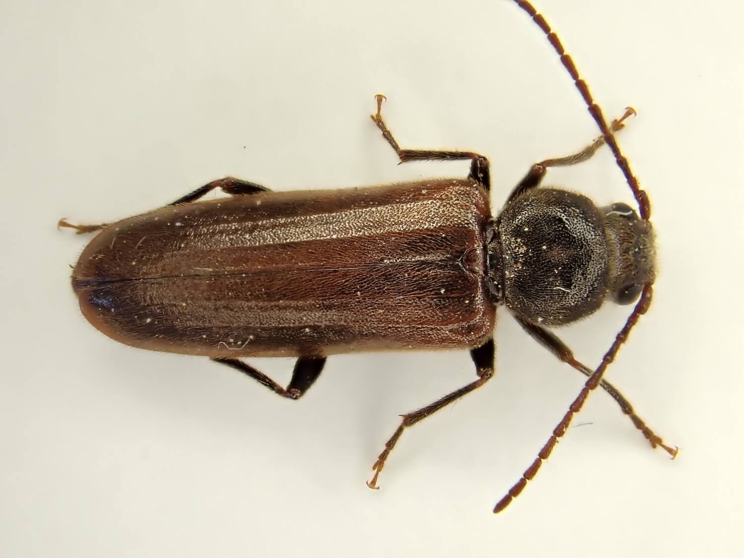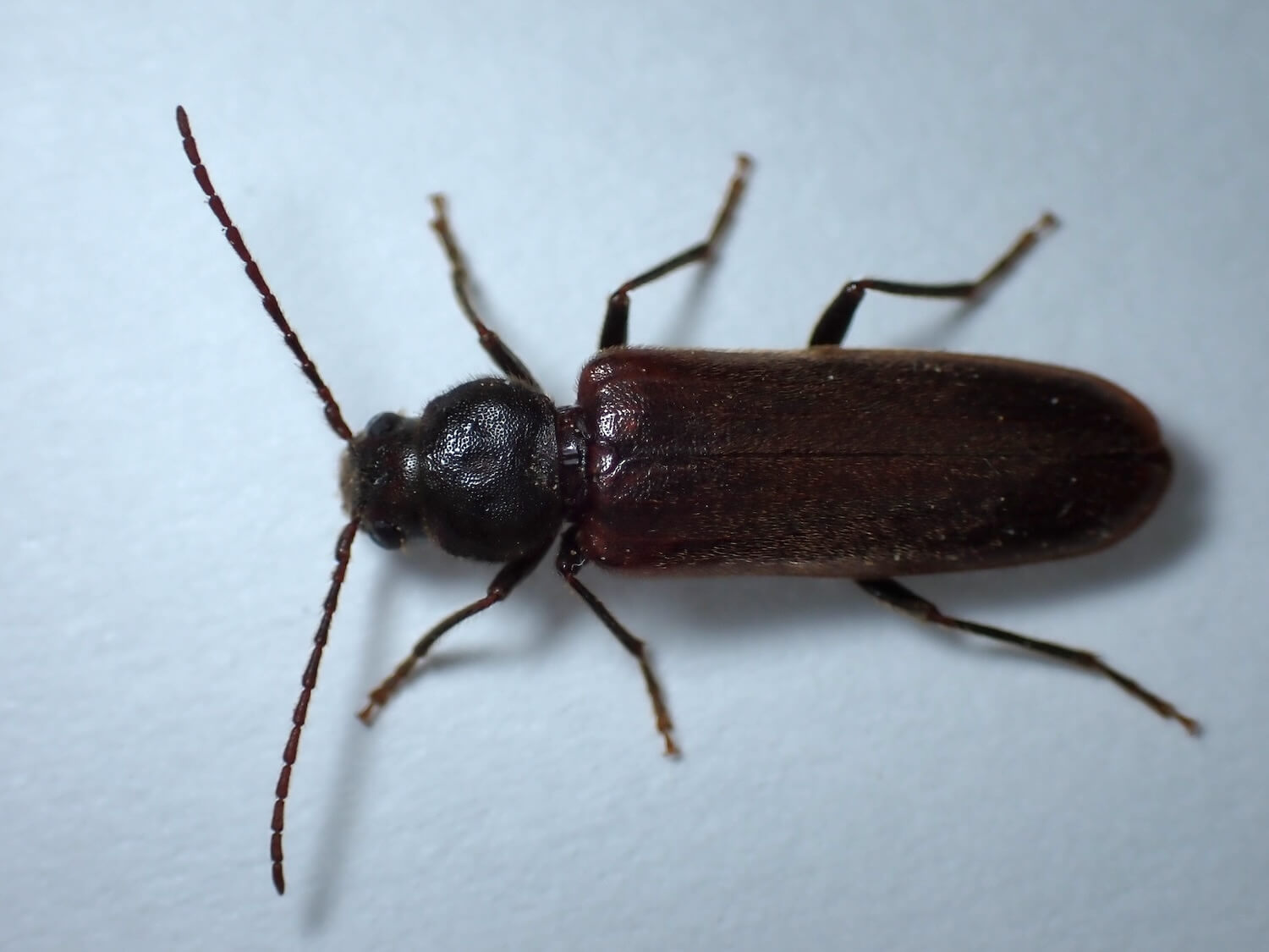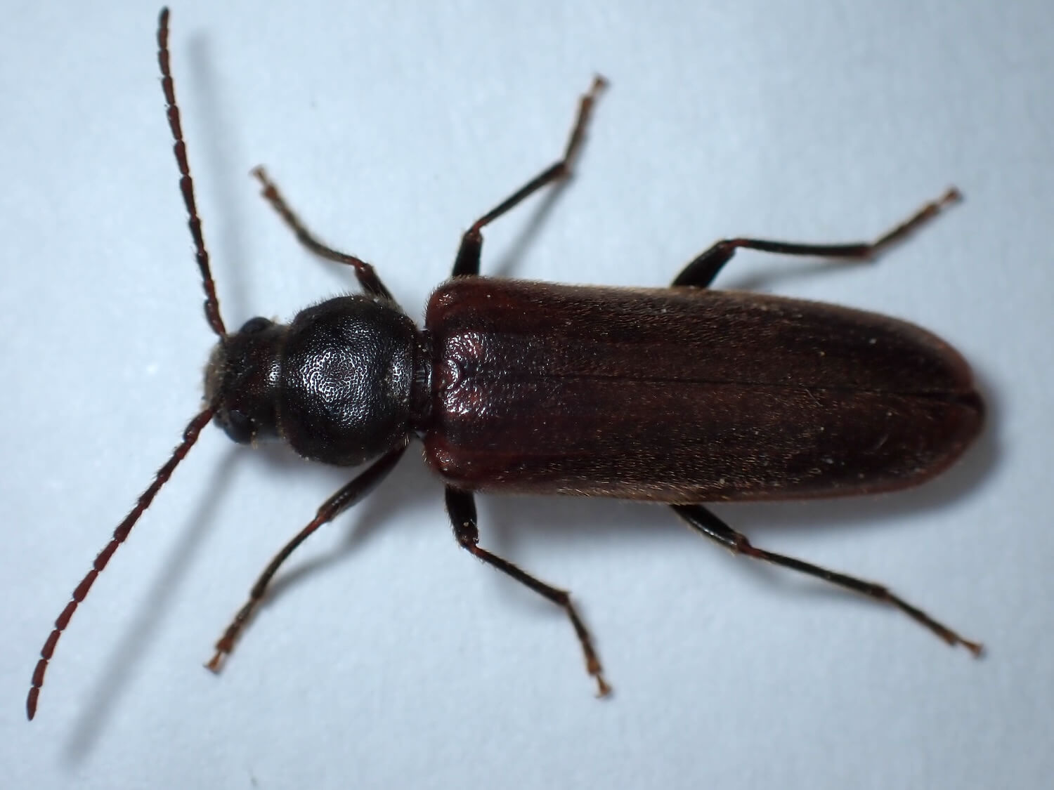前胸に弱い光沢がある。似ている種にオオマルクビヒラタカミキリがいる。